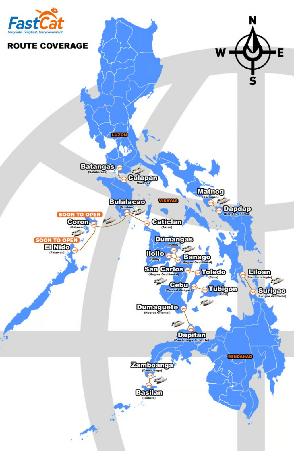 To serve the islands of the Philippines and its neighbouring countries, it aims to have a fleet of 30 vessels by 2030. The routes of FastCat are as follows: